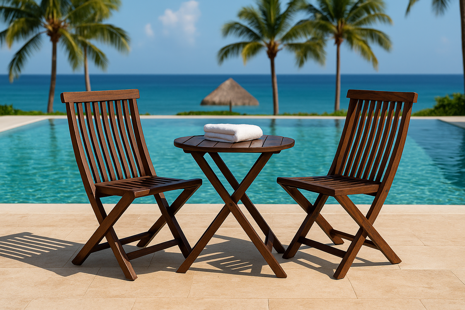 Made from high-quality wood with a fine walnut finish, the set is lightweight yet durable, easy to fold, and store when not in use. Perfect for morning tea, evening conversations, or poolside relaxation, this set adds timeless elegance to any outdoor or indoor setting.