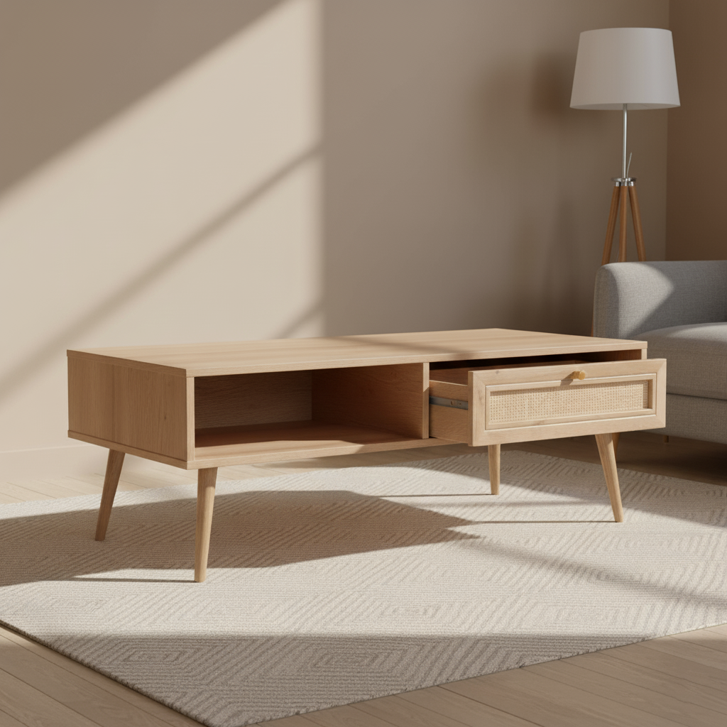 Natural Cane Detail: The drawer front features a cane rattan panel, adding texture and an artisanal touch.